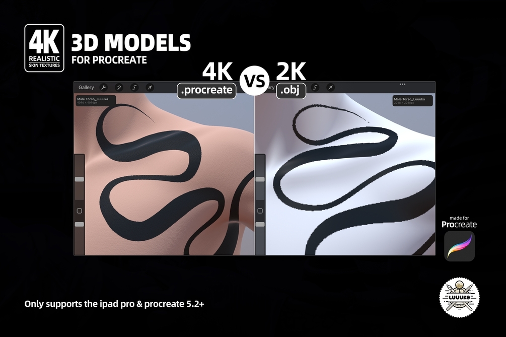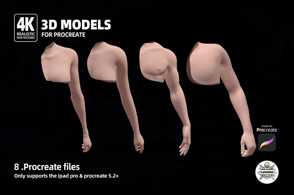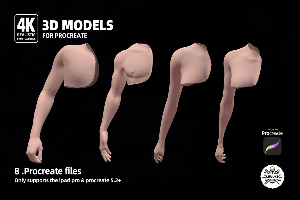 8 models .Procreate format files. Optimizing UV textures (4096 x 4096px). Easily recolor skin, adding textures, tattoos, patterns on it.